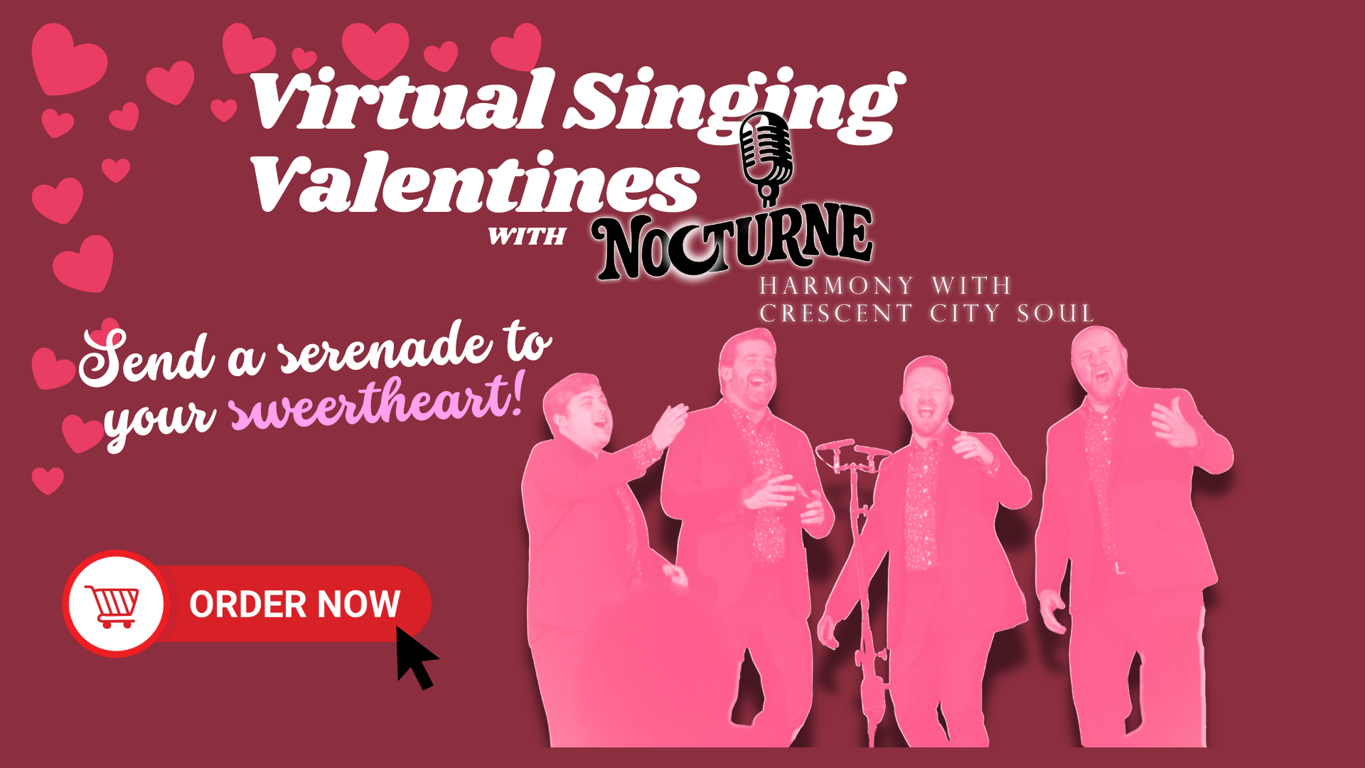 Nocturne is a unique and exciting a cappella quartet made up of singers predominantly based in New Orleans, LA. Featuring a repertoire for any occasion, Nocturne is eager to entertain and support the vibrant New Orleans community.